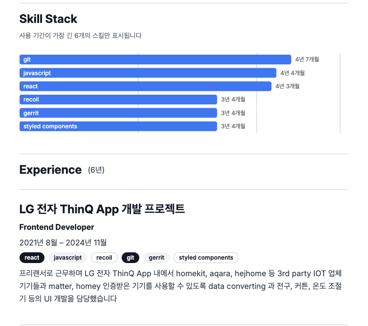 스킬 스택 시각화(Graph): 단순히 텍스트로만 나열하는 스킬이 아니라, 경력 카드에 입력한 정보를 토대로 본인의 숙련도를 한눈에 보여줄 수 있는 그래프 기능을 추가했습니다. 채용 담당자가 후보자의 강점을 시각적으로 빠르게 파악할 수 있도록 돕습니다.